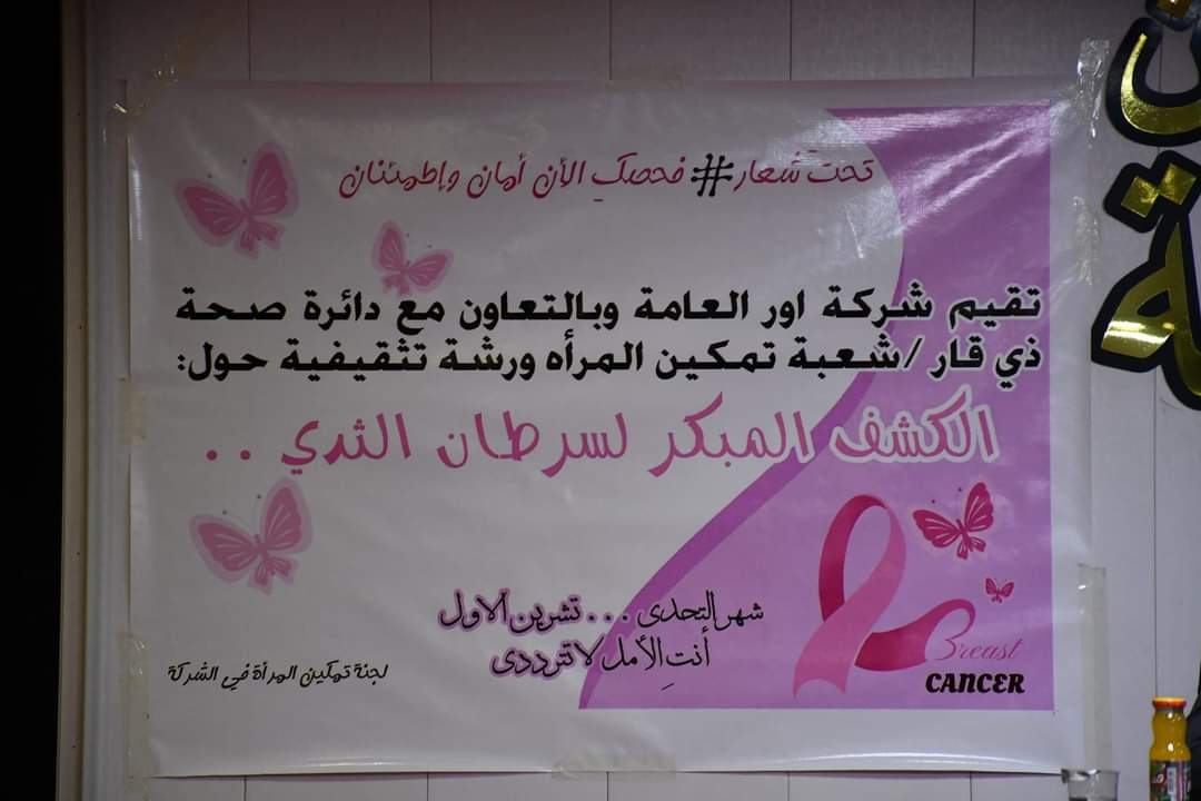 الورشة التثقيفية والتي أقيمت على قاعة أور للمؤتمرات والاجتماعات شهدت حضور نسائي للكادر النسوي في الشركة تطرقت للطرق الكفيلة بمكافحة سرطان الثدي بشكل مبكر....