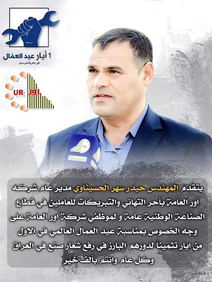في عيدهم العالمي. الاول من آيار يتقدم المهندس حيدرسهرالحسيناوي مدير عام شركة اور العامة بأحرالتهاني للعاملين في القطاع الصناعي عموماً ولموظفي شركة اور على وجه الخصوص وكل عام وانتم ابطالاً لصناعتنا الوطنية.