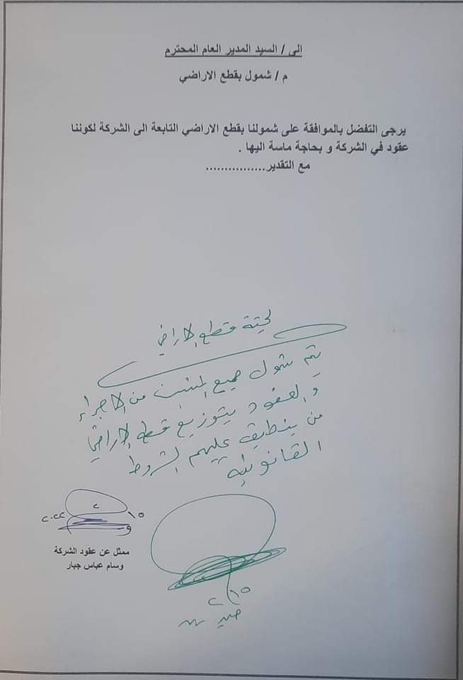 وجه السيد مديرعام شركة اور العامة المهندس حيدرسهرالحسيناوي اللجنة الخاصة بتوزيع قطع الاراضي السكنية لشمول العاملين في الشركة بصفة عقد او أجر يومي ممن تنطبق عليهم الشروط القانونية النافذة بتوزيع قطع الاراضي السكنية.